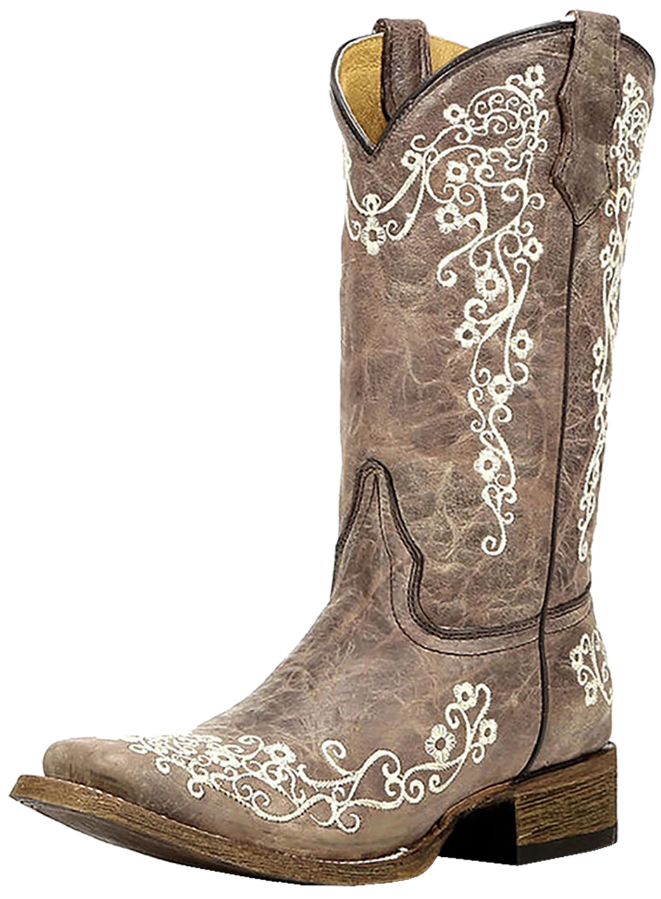 Corral Boots Corral Big Girl’s Square Toe Embroidery Cowgirl Boots – Brown