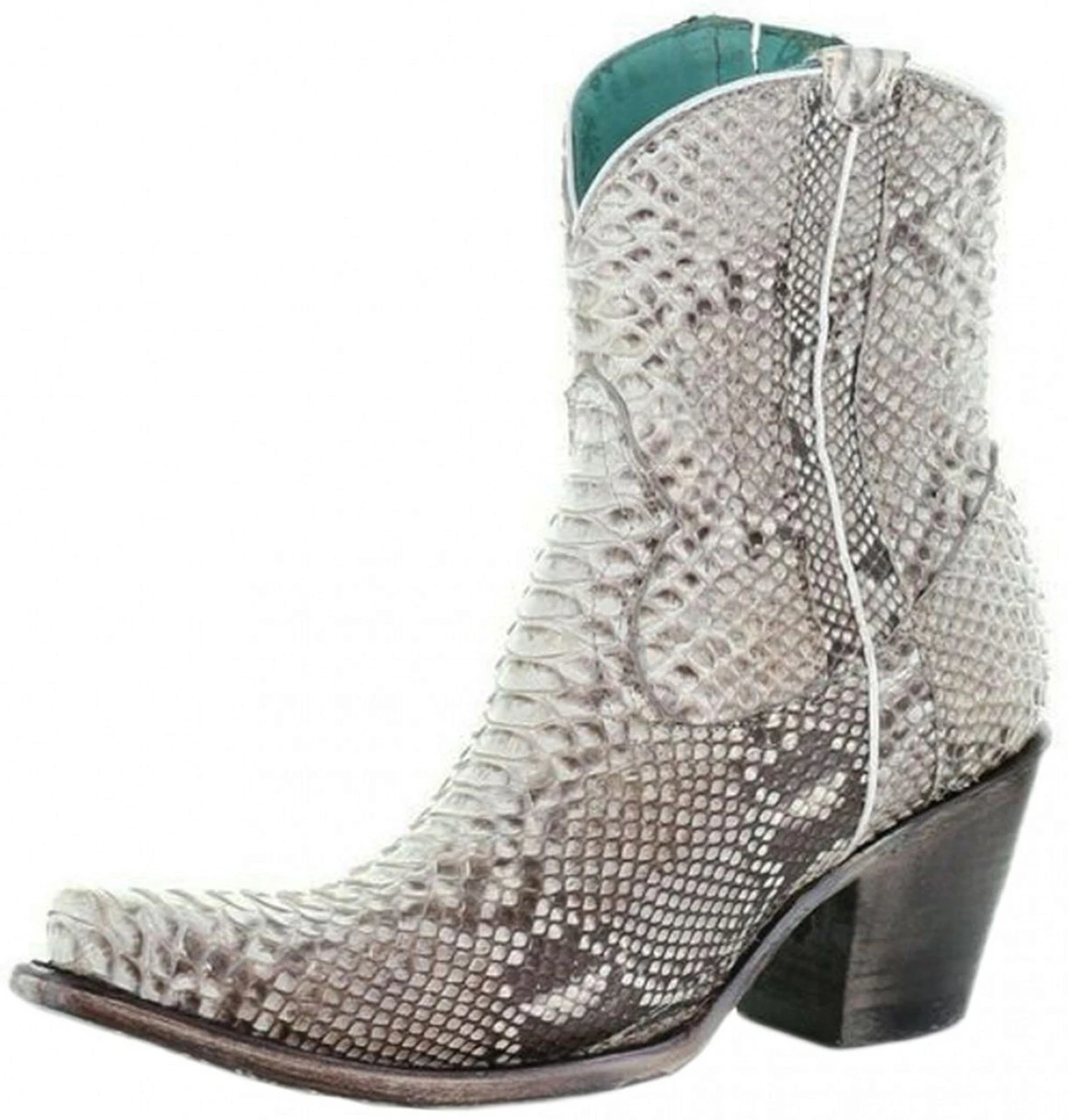 You willl have them doing a couble take with the Corral Women’s Python Zipper Ankle Boots! These women’s short boots feature a snip toe, natural python skin, interior zipper, and ankle height.