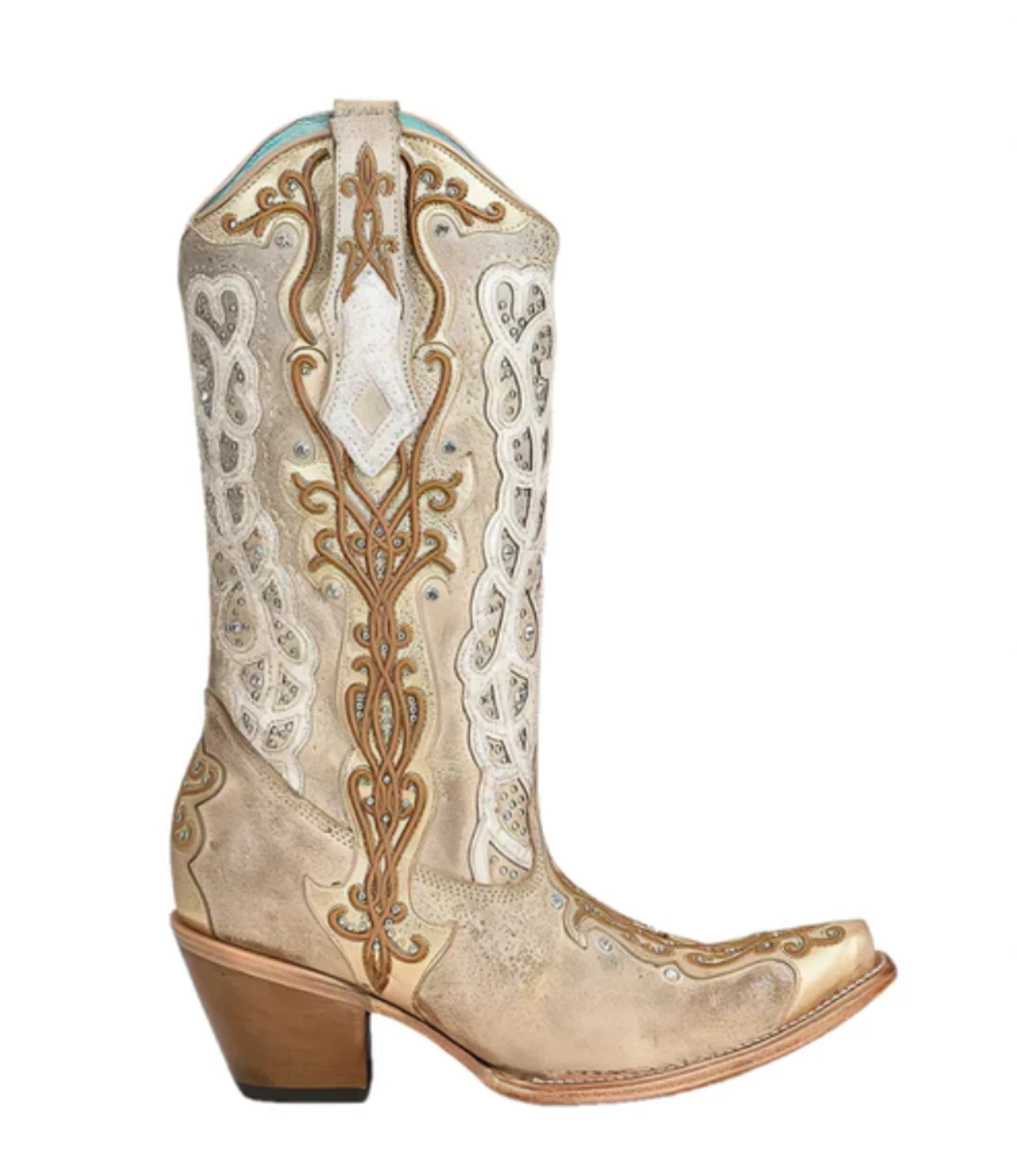 Corral Boots Lds Gold/Bone Overlay & Embr. & Studs & Crystals – C3895